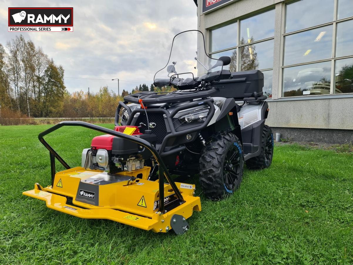 Rammy Brush Cutter 120 ATV PROFESSIONAL on tehokas ja kätevä raivaussaha mönkijään. Tämä voimakas leikkuri selviytyy vaivatta erilaisista kasvustoista. Se leikkaa helposti nurmikon, heinän, pajukon, kaislikon ja jopa 10 cm paksut puut! Raivaussahalla voi ajaa suoraan maata vasten, ja suojarulla sen alla pitää terät suojassa.